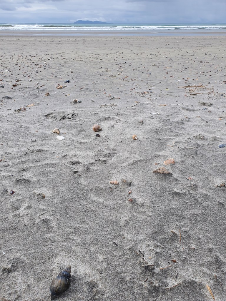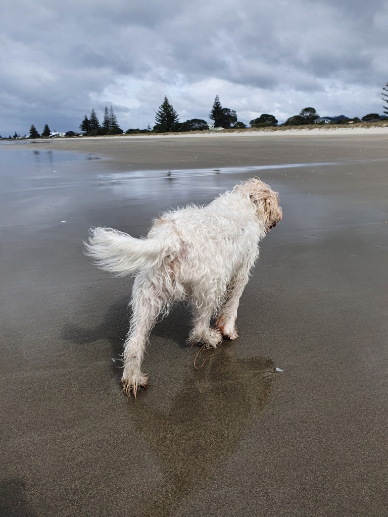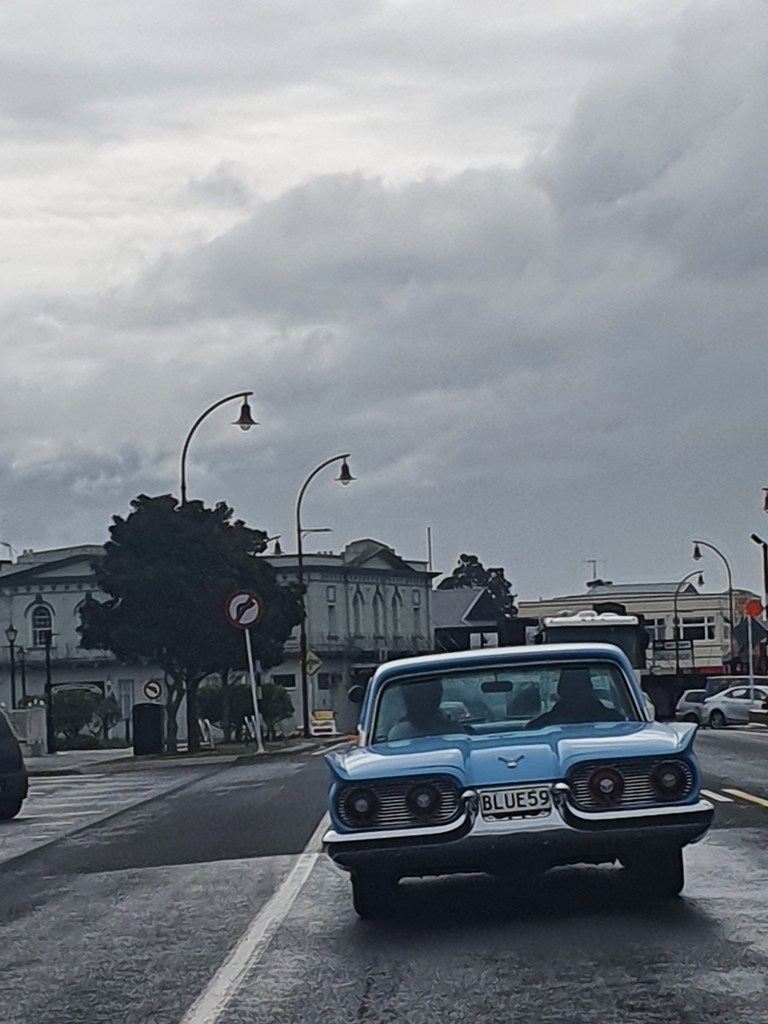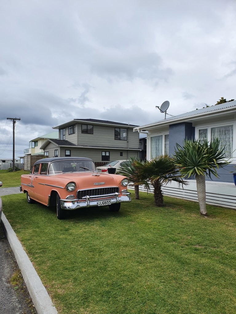 Piestājām arī Waihi pludmalē – iepazināmies ar suni, pasmaržojām brīvdabas kāpu pilsētas un nejauši izsekojām retro mašīnu no pilsētas līdz pat tās dzīves vietai.